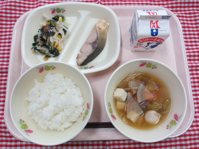 今日の給食は,ごはん,牛乳,ぶりの味噌焼き,水菜のサラダ,のっぺい汁です。