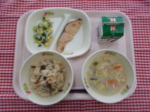 今日の給食は,きのこごはん・牛乳・さけの塩焼き・水菜と枝豆のサラダ・豆乳入りふるさと汁です。