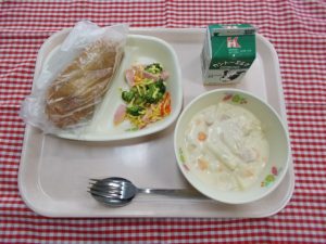 今日の給食は,きなこ揚げパン・牛乳・ハムとブロッコリーのサラダ・マカロニのクリーム煮です。