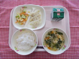 今日の給食は,ごはん・牛乳・ぎょうざ・バンバンジーサラダ・中華風卵スープです。