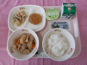 今日の給食は、「ごはん・味付けのり・牛乳・ローズポークと常陸牛のメンチカツ・水菜のサラダ・茨城県産豚肉と根菜の煮物・メロンゼリー」です。