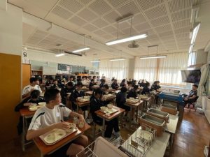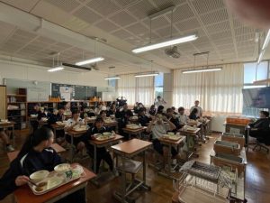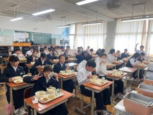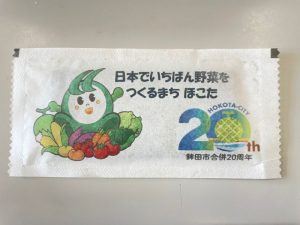 鉾田市誕生20周年を記念した献立です。鉾田市のコシヒカリ、鉾田市の20周年ロゴとほこまるのイラスト入りののり、県産ブランド肉を使ったメンチカツ、生産量日本一の水菜とさつまいものサラダ、野菜たっぷりの煮物、日本一のメロンゼリー・・・など鉾田市の魅力たっぷりの献立をおいしくいただきました。