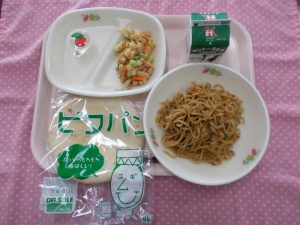 今日の給食は「ピタパン・牛乳・焼きそば・豆とチキンのサラダ・ミニりんごゼリー」です。