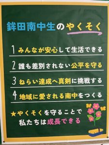 11月18日(火)南中学校のやくそく 鉾田南中学校の生徒会が作成した「鉾田南中学校のやくそく」です。 一つ一つの項目に思いをこめて、南中学校のために頑張る生徒会は とても輝いています。みんなでよりよい鉾田南中学校をつくってい きましょう。