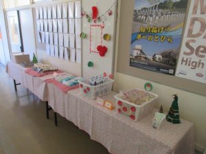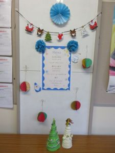 廊下には、配膳員さんがきれいに並べてくれたデザートや、文化部の生徒が作成したクリスマスツリーが設置され、職場体験を実施している2年生の生徒も飾り付けのお手伝いをしてくれました。