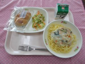 今日の給食は、「ミニロールパン・牛乳・ツナと豆乳のクリームスパゲッティ・チキンサラダ」でした。
