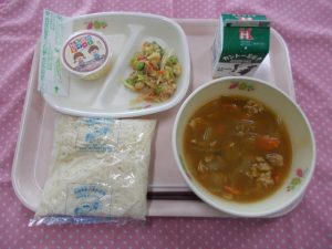 今日の給食は「カレー南蛮・牛乳・豆とツナのサラダ・給食週間ゼリー」でした。