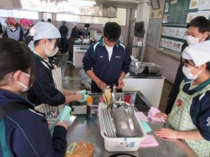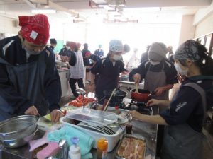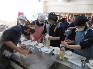 1学年で調理実習が行われ、豚の生姜焼きとミネストローネを作りました。班ごとに役割分担をしながら調理を進め、美味しく完成させることができました。