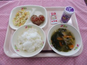 今日の給食は、「ごはん・発酵乳・ハート型ハンバーグ・チキンサラダ・わかめスープ」です。