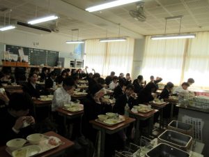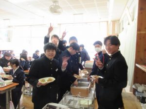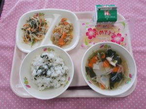 3月5日に、「鉾田南中学校リクエスト給食」として、「わかめごはん・牛乳・焼肉・ナムル・ワンタンスープ・クレープ」が出ました。食育委員会の生徒が中心となって考えたメニューの中から、全校投票で1位となったメニューです。