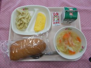 今日の献立は、「ミルクパン」「オムレツ(ケチャップ)」「ペンネソテー」「野菜スープ」「牛乳」でした。