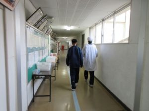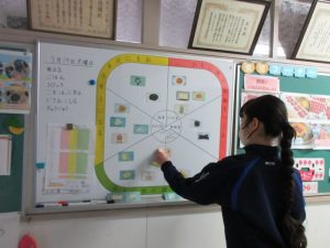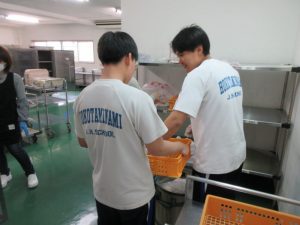 昼休みには食育委員会の生徒が配膳室で給食の片づけをしたり、食育黒板に明日の献立を掲示したりする姿が見られました。