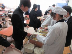 各クラスでは給食当番を中心に皆で協力して給食の準備・配膳を行っていました。