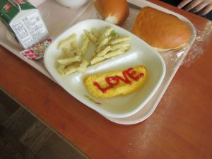 また、オムレツにケチャップで文字を書いたり顔を描いたりして給食の時間を楽しんでいたクラスもありました。