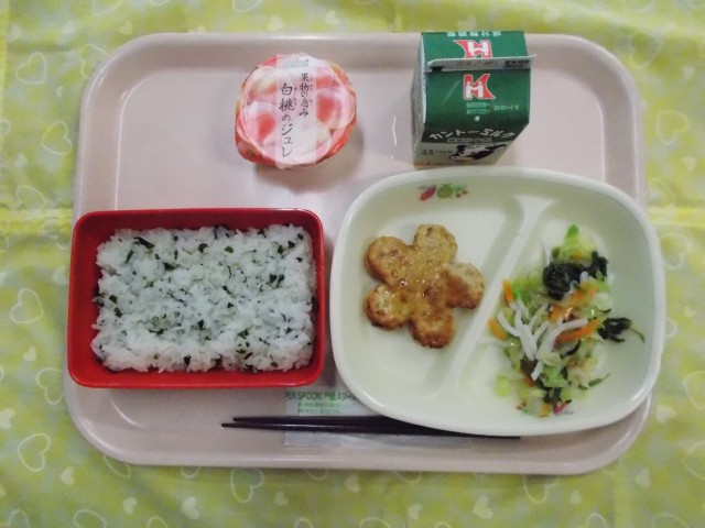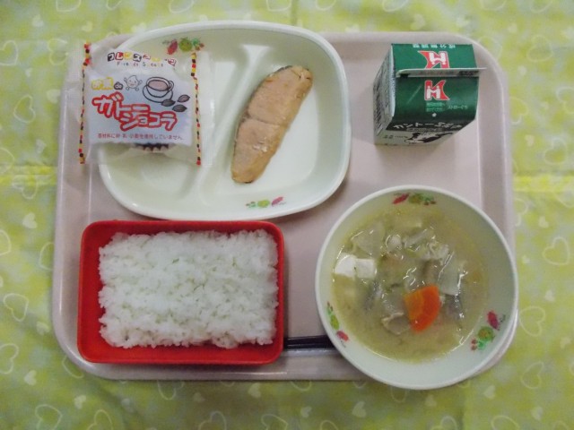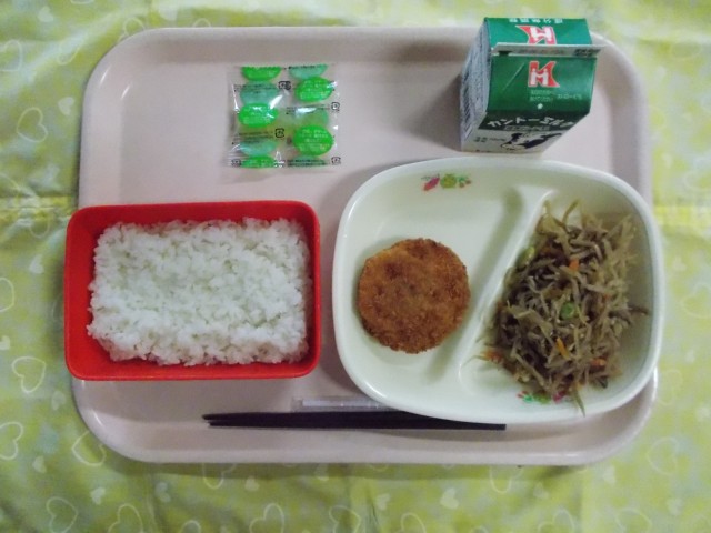 今日の献立はご飯・牛乳・れんこんのはさみ揚げ・きんぴらごぼう・青りんごグミです。「かみかみ献立」ということで,噛み応えのある食材がいっぱい入った献立でした。