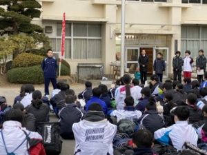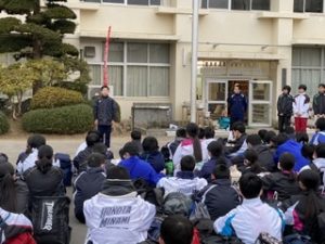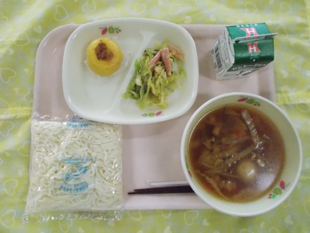 今日の給食はけんちんうどん・牛乳・おやき・きゃべつとハムのごまじょうゆ和えです。
