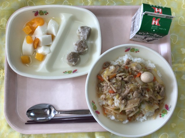 今日の給食は中華丼・牛乳・しゅうまい・フルーツ杏仁です。