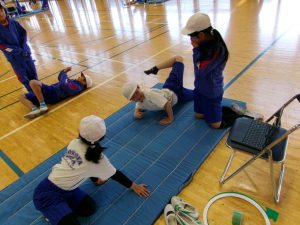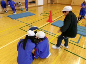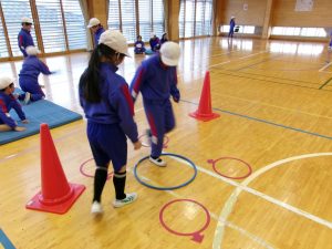 使う道具もグループによって様々で「マット使ってみようよ」「フラフープ使おう!」などみんなで話し合い進めていました。