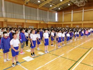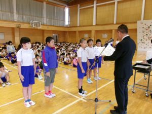 「前期を通して、体だけでなく、心も頭の中も大きく成長しました。1年生は、あいさつ・返事が素晴らしかったです。初めての運動会の練習もよく頑張っています。2年生は、お兄さん・お姉さんの顔になってきました。運動会でも1年生のお手本になっていますね。3年生はとても表現力が豊かです。授業でもよく考えている場面が増えてきました。4年生は、いつもメリハリのある授業をしています。これからも続けて頑張っていきましょう。5年生は、教の終業式に一番早く集合し、じっと静かに待っていました。半年後には6年生になりますね。期待しています。6年生は全校児童のお手本になっています。自分たちのことだけでなく、北小全体のことを考えて行動して本当に素晴らしいです。」とのお話がありました。