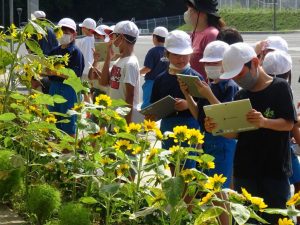 このひまわりは園芸委員会の児童が種をまき育てたものです。夏休み前に満開になりました。