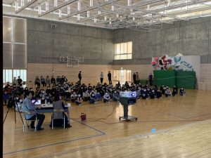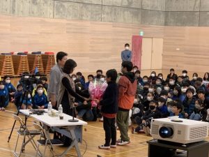 12月10日(水)にPTA企画委員会の企画によりPTA講演会が開催されました。講師に日本テレビ「ZIP!」等の番組作りを手がけている武井秀人さん、動画クリエイターの大迫瑞希さんをお招きしてテレビ番組作りや動画クリエイトの仕事の話を楽しくわかりやすくしていただきました。講演の最後には5、6年生全員を撮影し、大迫さんが作り上げた動画の作品をみんなで見るなど、楽しい企画となりました。