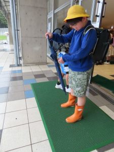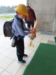 本日は朝から大雨。昇降口で、差してきたかさを閉じていました。