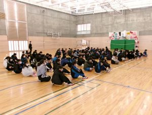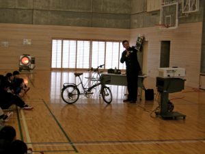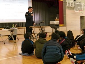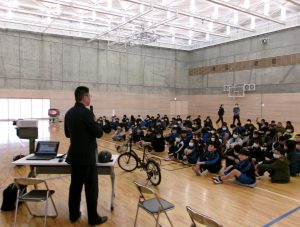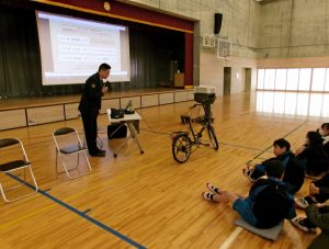 2月6日(金)6年生を対象に鉾田警察署交通課の方の指導のもと、交通安全教室が開かれました。中学校に進学した後、登下校等で自転車を活用する機会が増えることを見越して、自転車の乗り方、特にヘルメット着用の必要性についてお話をいただきました。自転車事故は被害に遭うこともあれば、加害になってしまうこともあり、死亡事故に至るケースもあることや、ヘルメットを着用すると、頭部の大けがの確率が著しく減少することなどを学びました。