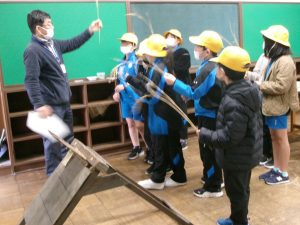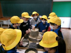 2月9日(月)に3年1組と2組が、2月24日(火)に3年3組と4組が社会科で「昔の道具」を学ぶために「とくしゅくの杜」に校外学習に行きました。「とくしゅくの杜」には実際に使われていた「昔の道具」が多数展示されており、「石臼」や「千歯こき」「唐箕」など、実物にを前に興味津々の様子でした。実際に道具を手に取ったり使ったりしながら、体験的に楽しく学ぶことができ、有意義な校外学習となりました。
