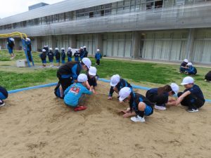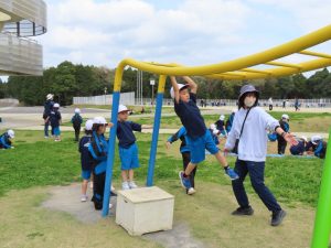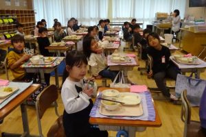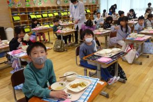 1年生は、屋外の遊具で遊んだり、教室で過ごしたり、体験がいっぱいの1日でした。今日は小学校で初めての給食です。少し早めに準備をして、ゆっくり食べました。