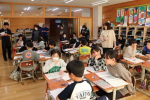 本日3年生が社会科の授業でゲストティーチャーを呼んで話を聞きました。鉾田警察署大蔵駐在所の警察官の方々にご来校いただき、お話をしていただきました。警察署のヒミツをたくさん知ることができました。