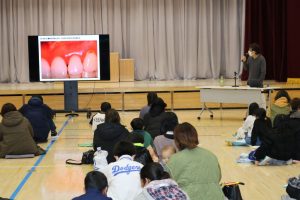 本日、3年生が親子歯科保健指導を開催しました。講師は、柳沢歯科医院の柳沢秀樹先生と歯科衛生士のみなさんで、歯みがきについて詳しく教えていただきました。染め出しも実施し、よく磨けているところと磨けていないところを確認することができました。歯科衛生に対する意識がさらに高まりました。