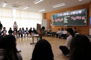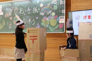 本日、2年2組で1年生を対象に劇の発表がありました。国語の授業で学習した「お手紙」を劇にしたもので、発表を見に来た1年1組の子どもたちも真剣に見入っていました。小道具や大道具なども自分たちで工夫して作り、とても見ごたえのある劇になりました。2年2組のみなさん、とっても上手にできましたね。