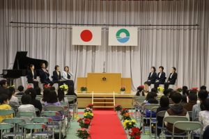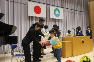 5年生の代表による作文発表。今年楽しかったことやがんばったことの発表のあと、みんなの手本となるような6年生になりたいと決意を述べました。大変立派でした。