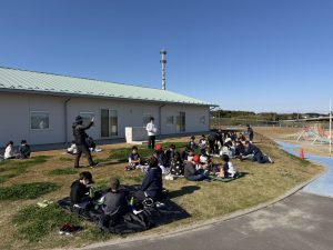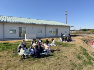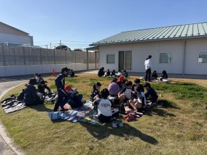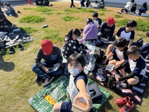青空の下でみんな楽しそうにお弁当を食べていました。