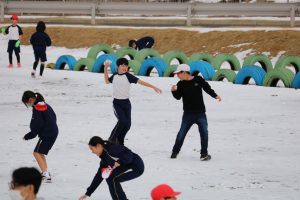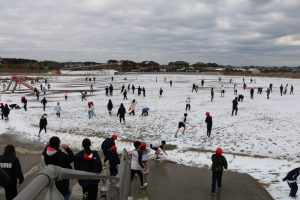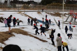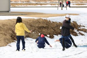 当然、雪遊びでしょう。子どもたちは一目散に校庭にかけだしてきました。雪合戦をする子、雪だるまを作る子、雪の斜面をすべる子など、思いっきり楽しんでいました。もちろん、手足の冷たい午後になったことは、言うまでもありません・・