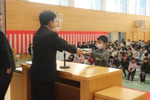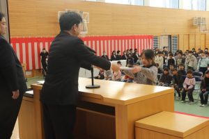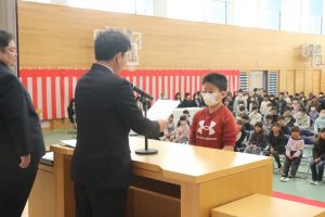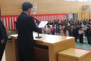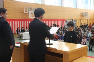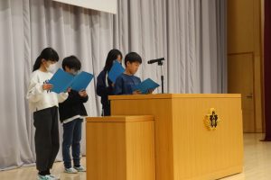 5年生の代表による作文発表。今年楽しかったことやがんばったことの発表のあと、みんなの手本となるような6年生になりたいと決意を述べました。大変立派でした。
