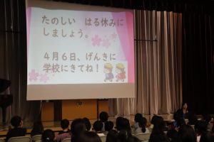 式後には、生徒指導主事の大野先生から春休みの生活についてのお話がありました。きまりを守って安全に生活してほしいとの話でした。