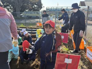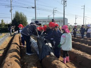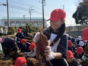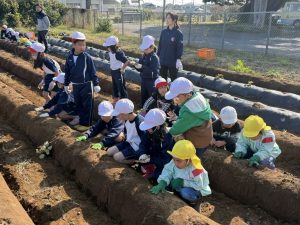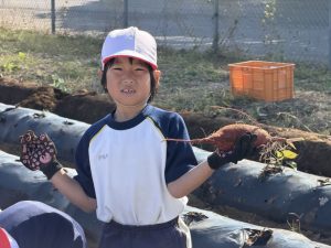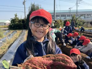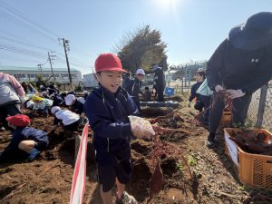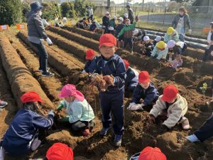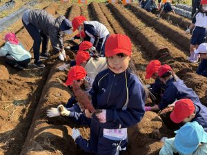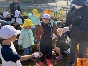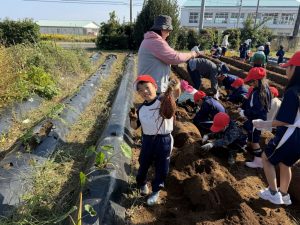 幼稚園の先生の説明をよく聞いて、作業を一生懸命に行なっていました。大きな芋、小さな芋、様々な形をした芋があり、いろいろな形に驚きながらみんな楽しくに芋掘りができました。大きな芋を掘ることができた児童は、カメラに向かって笑顔でポーズを決めていました。