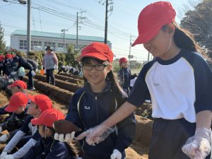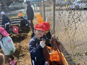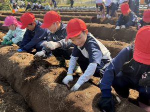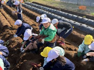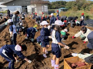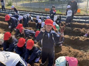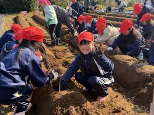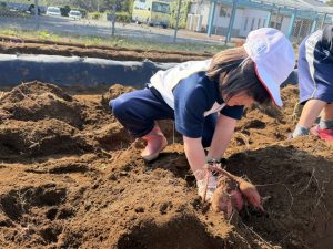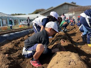 幼稚園と小学校の交流として、5月に植えた芋の芋掘りを本日行いました。