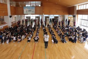 昨日、1・5年生が昼休みに姿勢教室を実施しました。講師の小見先生の合図に注意しながら、走ったり・止まったりしながらゴールを目指しました。最後はチームで協力して、だるまさんが転んだをしました。