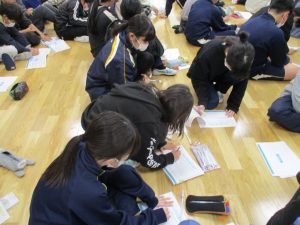 本日、6年生がインスタントシニア体験を実施しました。講師に鉾田市社会福祉協議会の皆さまを迎え、実際に高齢者はどのような感覚で生活しているのかを体験しました。「体が重くて起き上がるのがつらい。」「耳が聞こえにくくて声が大きくなっちゃう。」「視界が悪く、砂嵐の中にいるようだ。」などの感想が聞かれました。高齢者の立場に立って考えることができました。