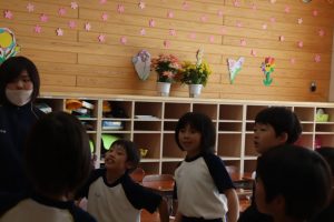 はじめての縦割り班遊びで、「風船遊び」を行いました。みんなで手をつないで、風船を落とさないように工夫して遊びました。