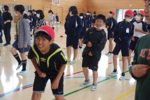 今日の姿勢教室は、縦割り班で行いました。全体で体幹を鍛えたり、体をほぐしたりする動きをやったあと、身体を大きく使った「後出しじゃんけんゲーム」をしました。6年生のリーダーが出したじゃんけんに勝つものを、他のみんなが身体を大きく使って表現しました。