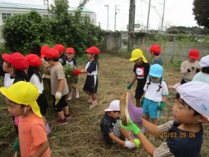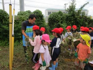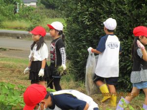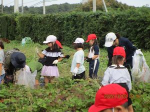 未分類 幼・小交流(草抜き) 2025年10月3日 admin 2時間目に、5月につばさ幼稚園の畑に本校の1年生と幼稚園児で植えた芋の苗の周りの草抜きを行いました。 軍手や長靴の準備万端で、先生方の話をよく聞いて一生懸命に作業しました。