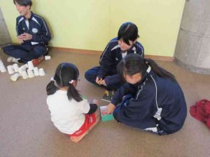 本日、家庭科の授業の一環で、3年2組の生徒が、つばさ幼稚園に幼児触れ合い体験学習に行きました。大洋保育園の園児たちも参加し、生徒たちが持参した手作りのおもちゃで一緒に楽しく遊ぶことができました。