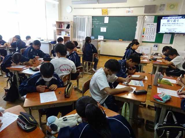 本日は、5時間目に全校道徳が行われました。生徒会が全学級をズームでつなぎ、スマホの使い方について意見を聴き合い、考えを深めました。