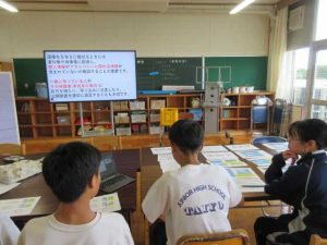 2・3時限目に、1学年による、「災害について考える」学習会の発表が行われました。