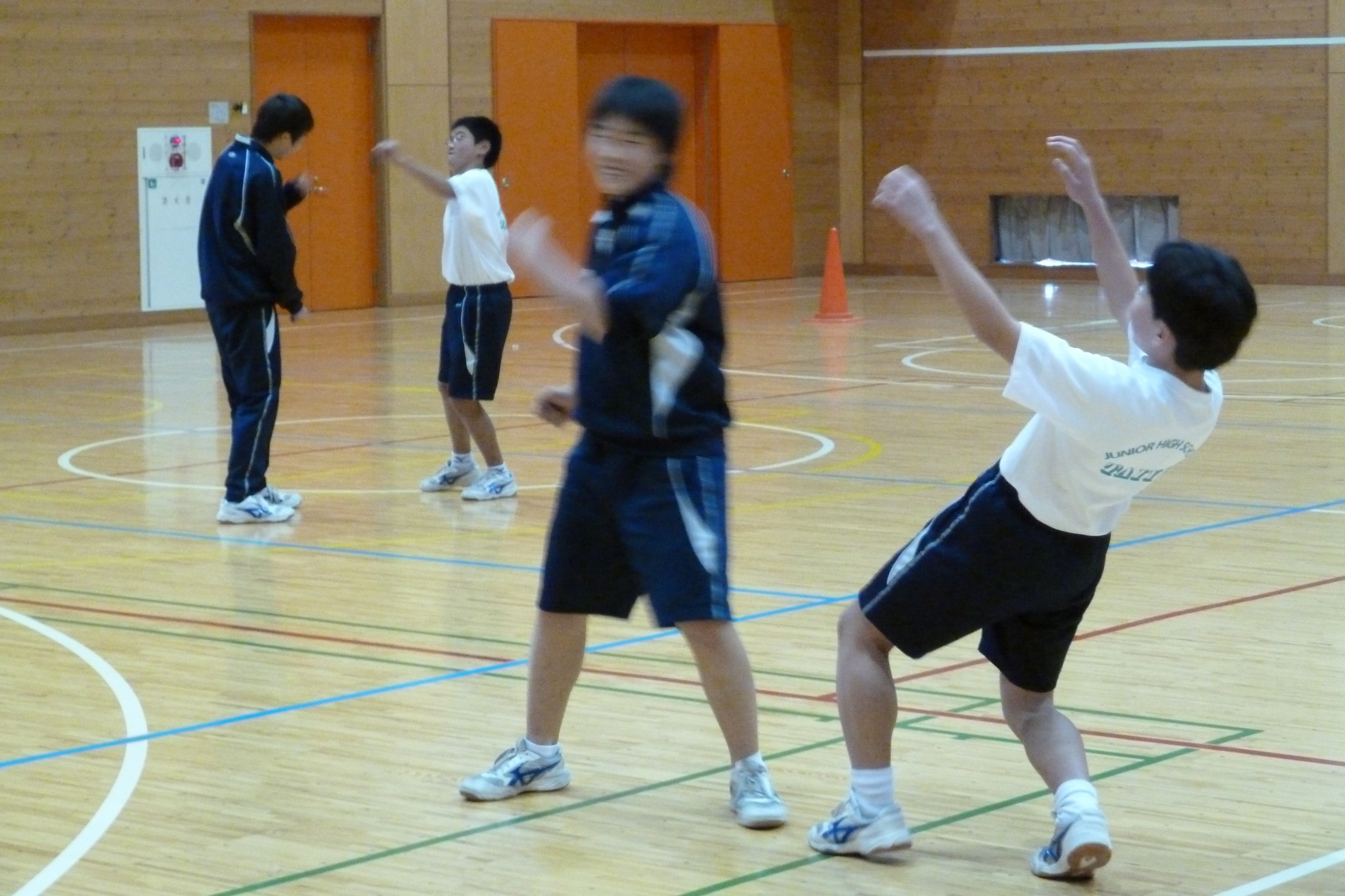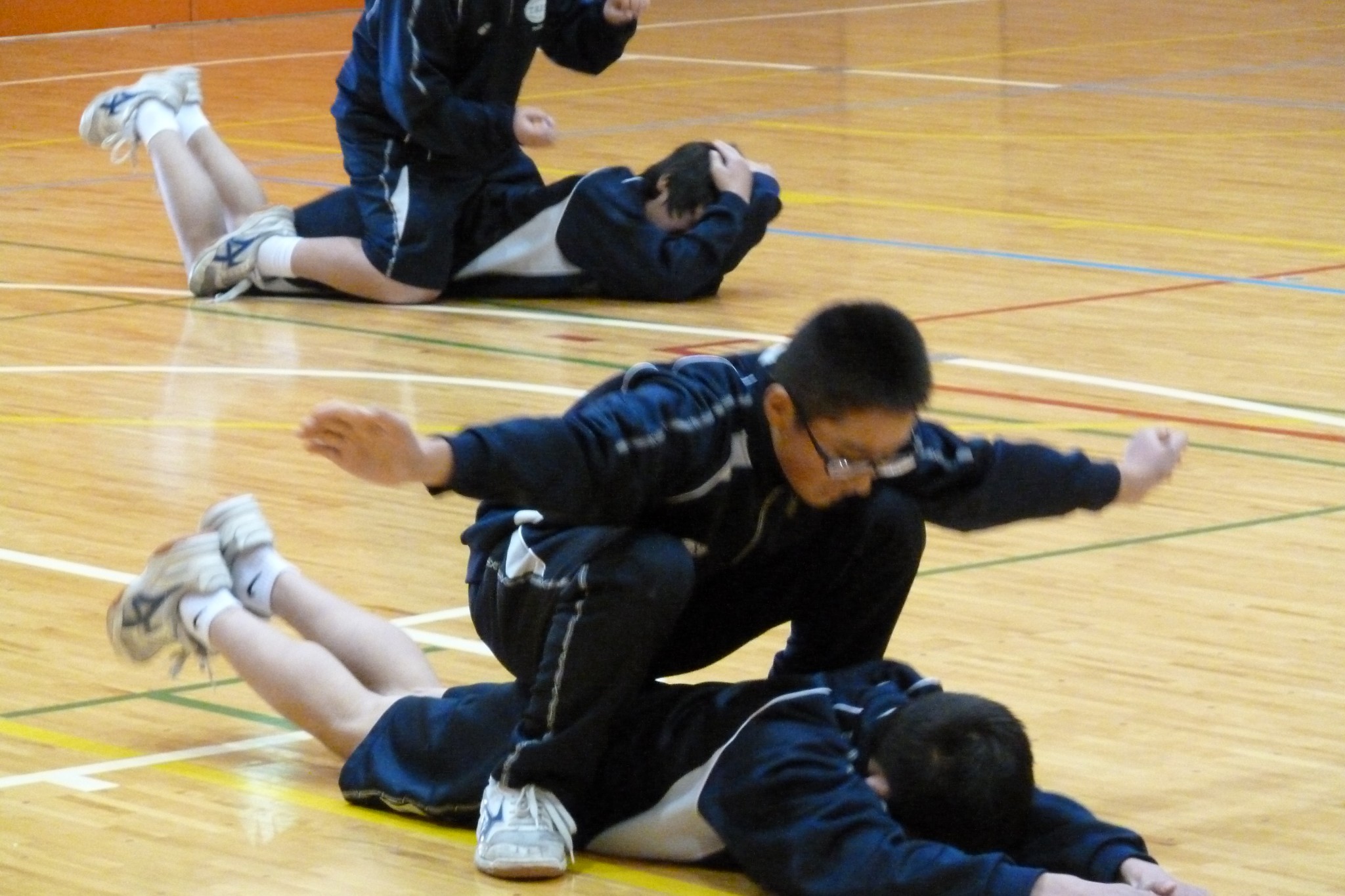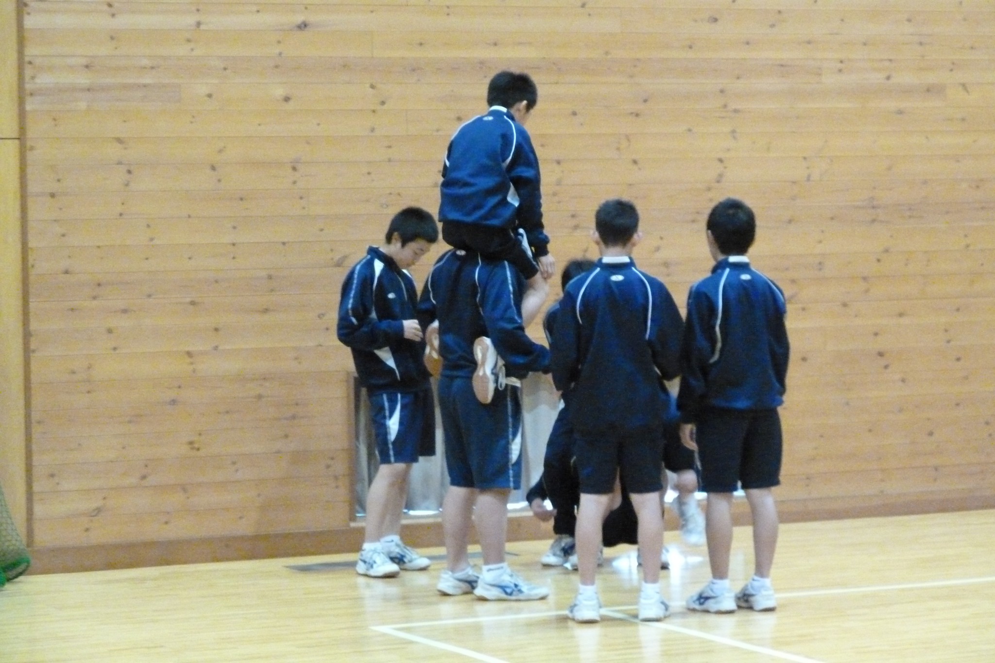 第1学年 12/13 体育の授業の様子(表現運動) 2016年12月13日 大洋中学校 3校時,1年生の学年体育で表現運動の研究授業を行いました。「集団で課題に合った動きをしよう。」という課題で,学習しました。2人組,4人組,8人組とだんだん人数を増やしていき,それぞれ決められた課題を自分達で考えて,表現していました。楽しそうに活動していました