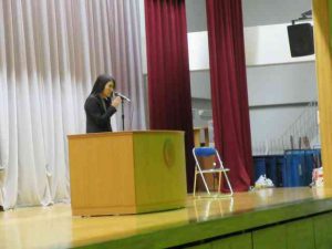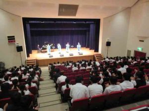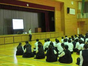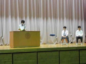 前期終業式が行われ、各学年から代表生徒の作文発表がありました。また、本日より新しいALTの先生をお招きし、ご挨拶をいただきました。