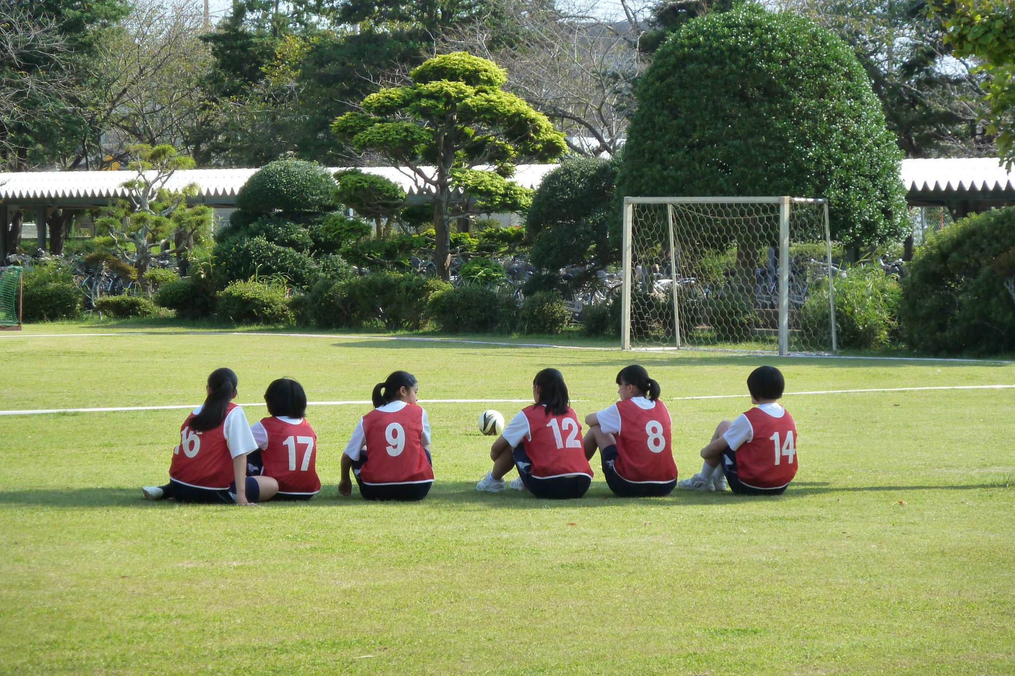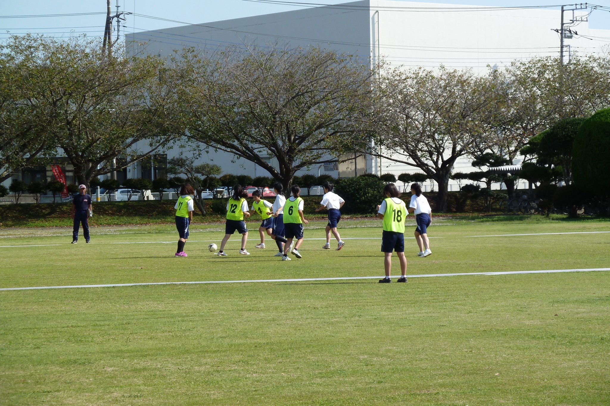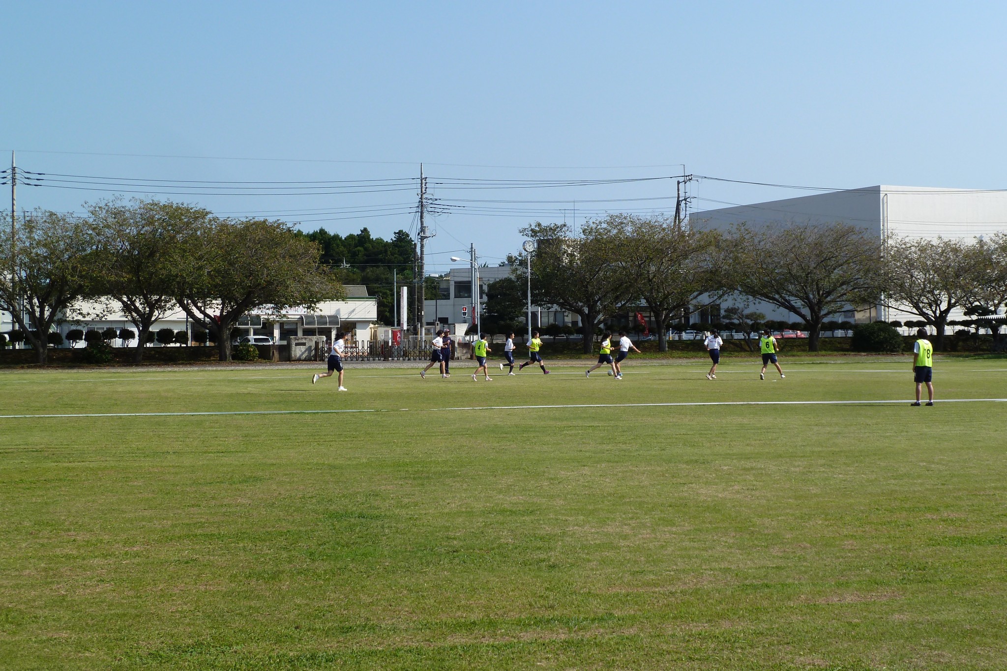 第3学年, その他 9/25 秋空の下芝生でサッカー 2017年9月25日 大洋中学校 秋空の下,校舎前の芝生で3年生女子が体育の授業でサッカーを楽しそうに行っていました。校舎前の芝生も太陽の光を浴びて緑のカーテンの様です。
